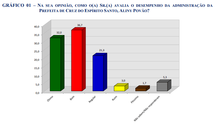 A pesquisa mostra que 32% dos entrevistados consideram ótimo, 36,7% avaliam como bom e 21,3% regular, enquanto 3% classificam como ruim a gestão e 1,7% consideram a administração péssima. Não sabem ou não responderam somam 5,3%.